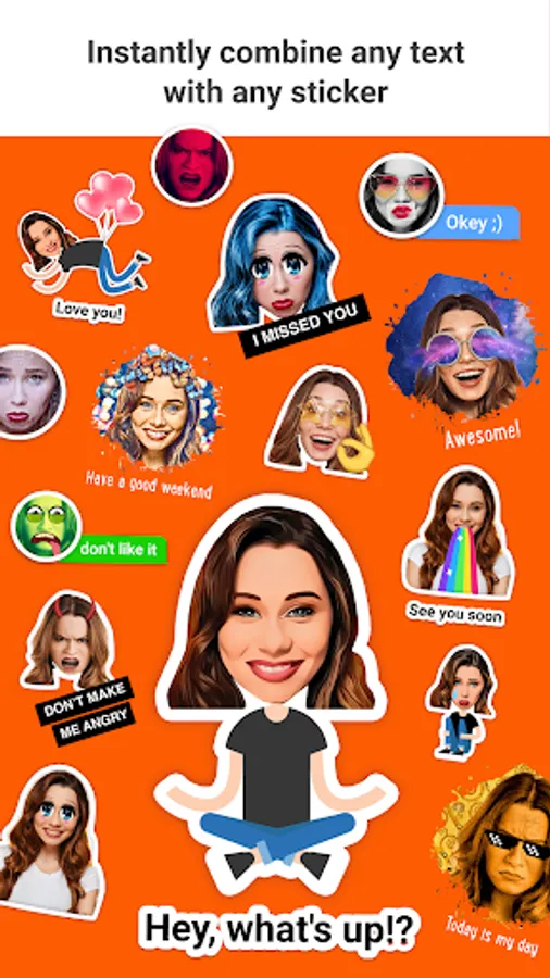 First of all, it uses your portrait picture (just one) to generate dozens of personalized stickers various in design and layout. So you get many sets of unique images with YOU on them.