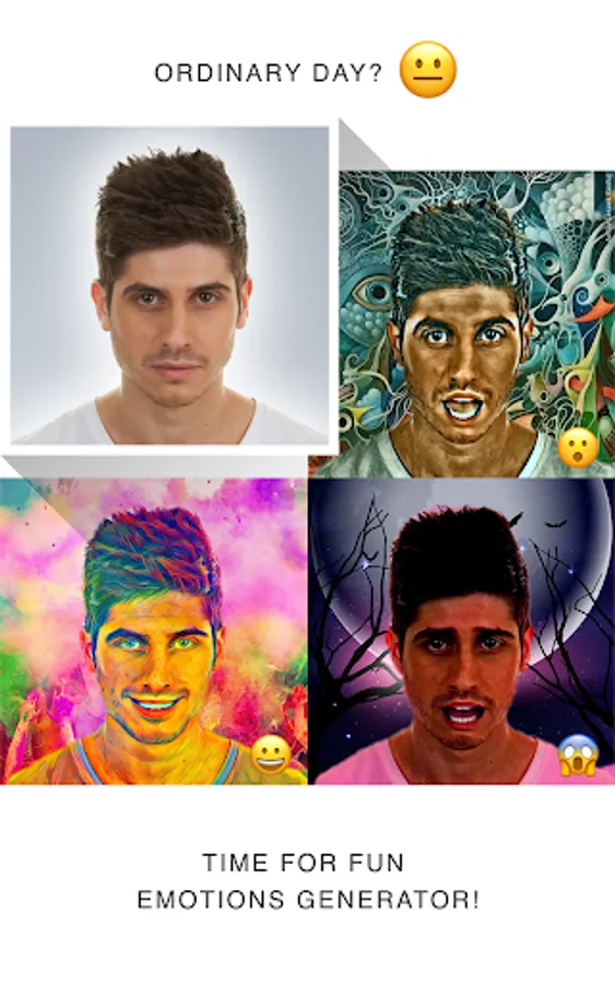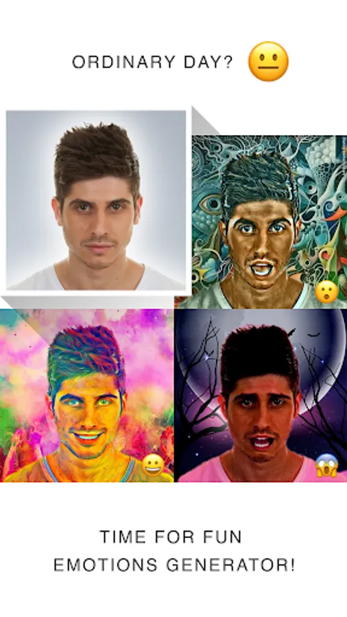 ArtMyMood - the first ever empathic selfie app! Powered by AI and can recognize emotion and automatically style your selfie in accordance with your mood. Stop for a moment and make a selfie: (Bang) you're a devil burning with anger; (Bang) you're an angel in a rainbow sky; (Bang) a ghost completely lost in the dark woods.