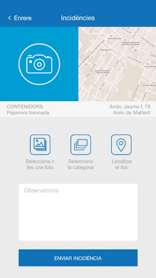 MALFERIT AIELO OF A CLIC is an application of the municipality of Aielo of Malferit, communication and incident management in urban infrastructure and citizen participation. Allows citizens of Aielo of Malferit directly notify the municipality in real time, various types of incidents, faults or damage that can be found in the locality.