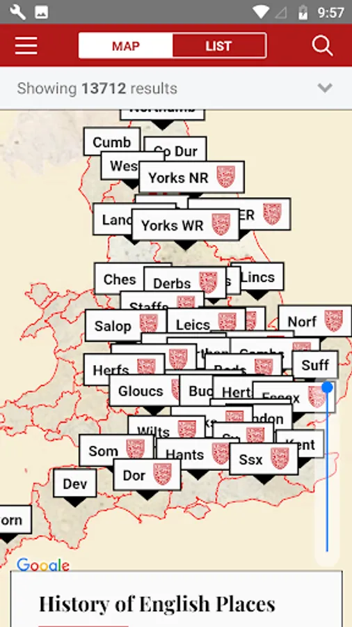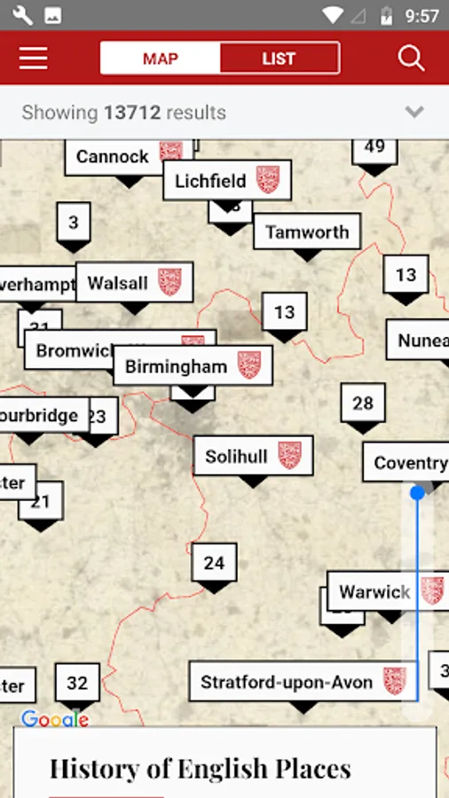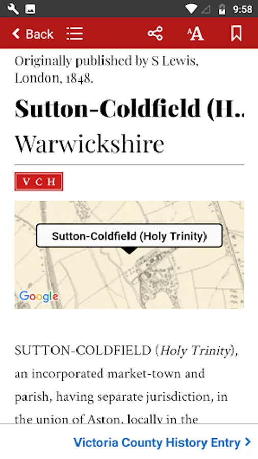 The History of English Places is a map-based smartphone app for discovering the rich history of places in England. Information is drawn from the Topographical Dictionary of England (Lewis, 1848) and the place-by-place histories of the Victoria County History (VCH), published between 1901 and the present day.