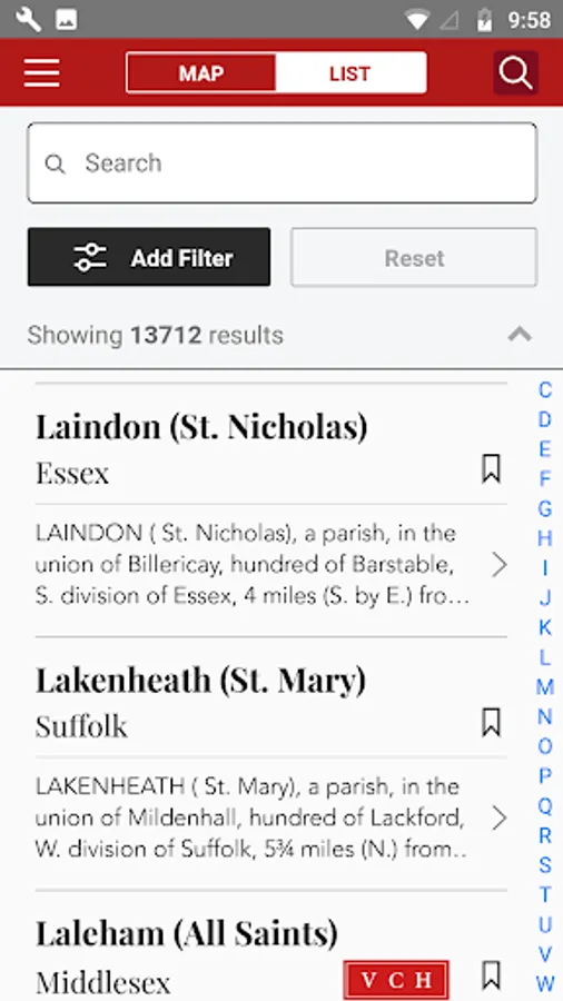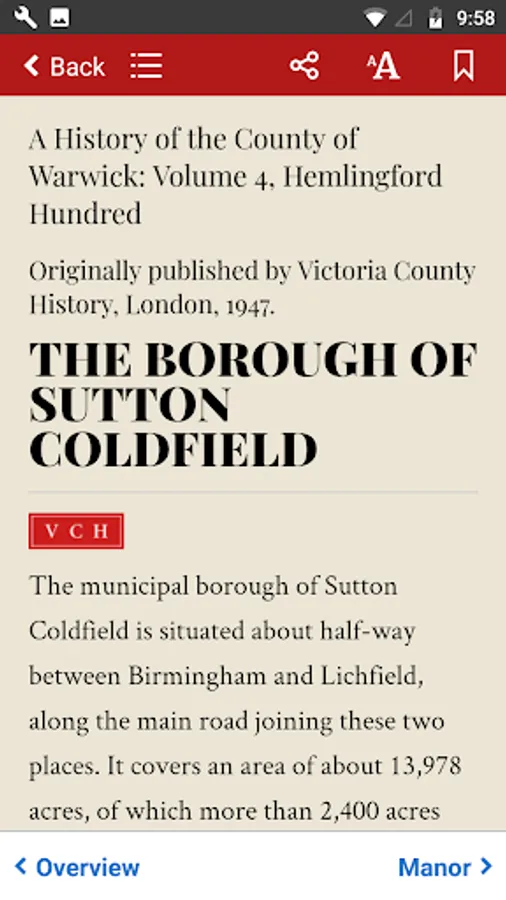 Every place in England has an entry in the app, with detailed VCH accounts for many places. The VCH is an ongoing, growing project, with histories written over the last 120 years, and more in progress.