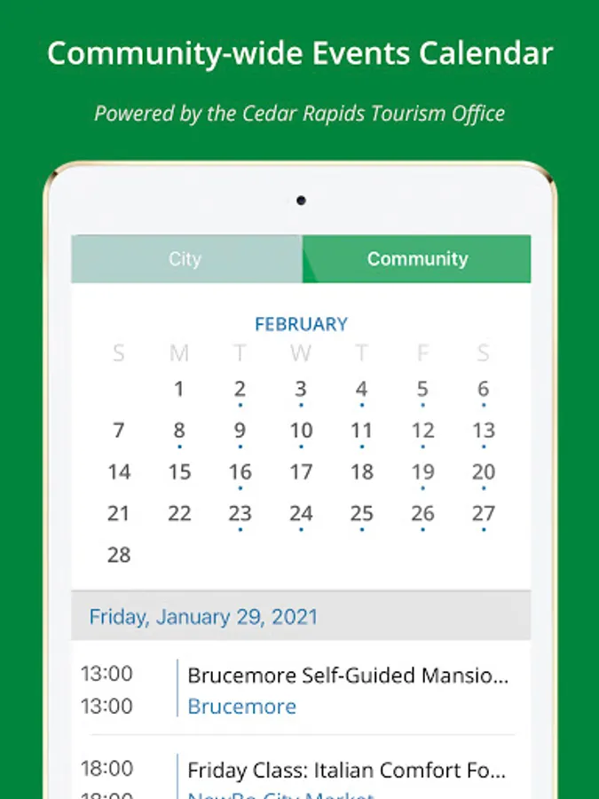 Enjoy 11 new and refreshed features — including a community-wide events module that can pull events from the Cedar Rapids Tourism office right into your calendar. Get the latest City News sent right to your pocket. See the City in a new way with 360° Views. Check out the latest deals and discounts in the new Coupons module. And never miss a message with our incredibly useful inbox feature.
