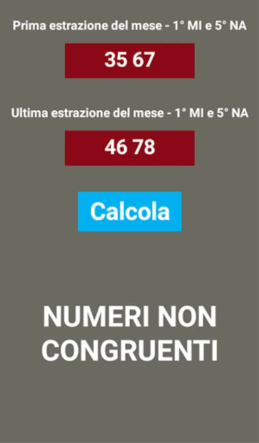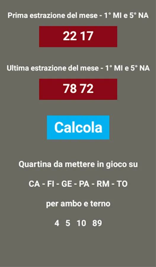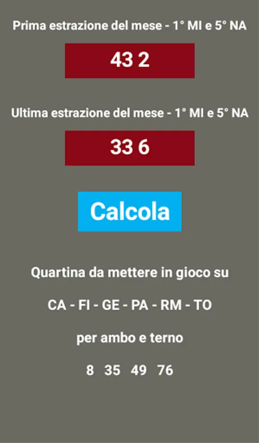 You must act on the first and last drawing of the month by examining the first extract on the wheel of Milan and the fifth extract on the wheel of Naples. The method obtains a quatrain for both parties to play on the wheels of Cagliari, Florence, Genoa, Palermo, Rome and Turin for a maximum of one month with the exclusion of the sortie wheel. Repeat the forecast every beginning of the month. To reset the data, long touch on "Calculate".