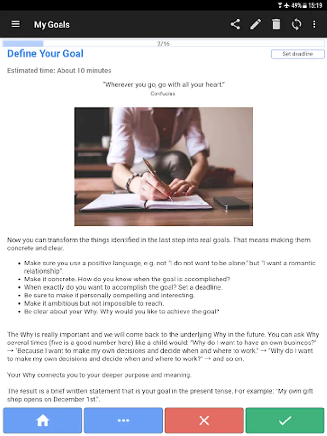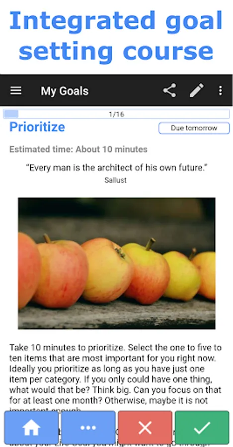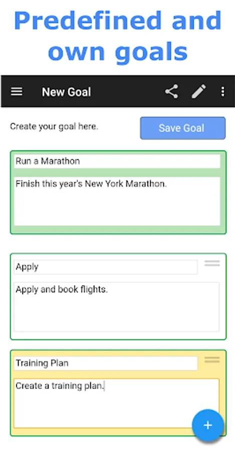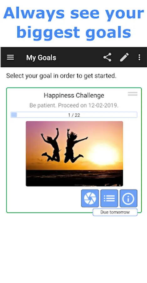 Our goal is to provide you with a simple, easy to use goal setting and motivation tool in your pocket. VidaGoals helps you to find and to reach your goal and motivates you to stay on track. A goal is specific, has a target date, a strong “why” and always a next action.