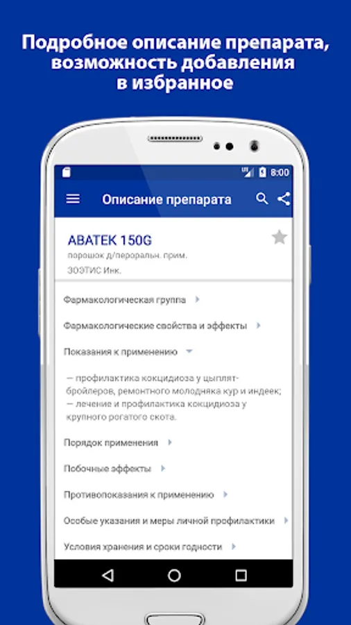 The description of each drug contains information about the trade and international name, composition and form of release, pharmacological (biological) properties and effects, indications and procedures for use in animals of different groups, side effects, contraindications to use, special instructions, personal prevention measures, storage conditions and expiration dates.