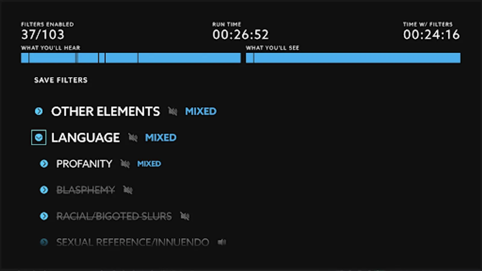 • Choose the types of things you don't want to see or hear (profanity, graphic violence, nudity, etc)