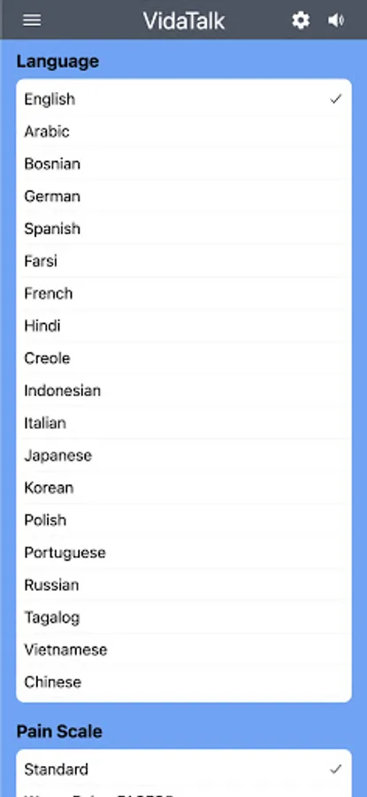 This version of VidaTalk includes English and bilingual communication with both verbal and written translation for 40 languages: Amharic, Arabic, Armenian, Bosnian, Burmese, Cantonese, Chinese, Creole, Czech, Dari, Dutch, English, Farsi, French, German, Greek, Hindi, Hmong, Indonesian, Italian, Japanese, Khmer, Korean, Lithuanian, Marshallese, Nepalese, Pashto, Polish, Portuguese, Punjabi, Russian, Somali, Spanish, Swedish, Tagalog, Thai, Tigrinya, Turkish, Ukrainian, and Vietnamese.