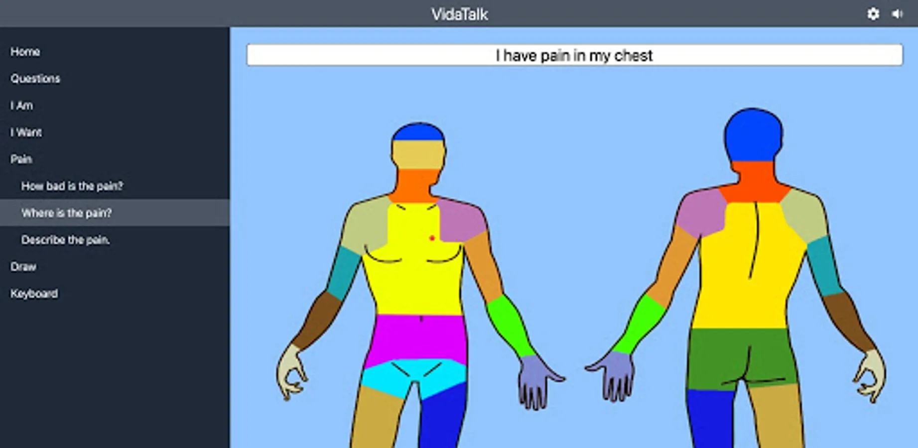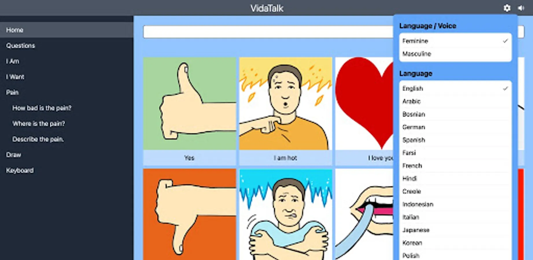 VidaTalk™ is an interactive, multilingual communication tool for non-verbal patients, also serving facilities where patients and providers may speak different languages. VidaTalk is specifically designed and tested for the hospital environment with funding support from the National Institutes of Health, National Institute of Nursing Research NR014087. The most common phrases used by hospitalized patients can be selected with a single touch. Patients may also type personalized messages and draw with their finger which allows for quick, easy and customizable communication. Words and phrases specific to their needs are expressed through recorded audio across gender and language, giving every patient a voice.