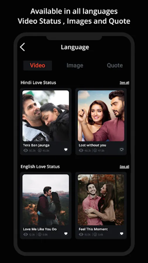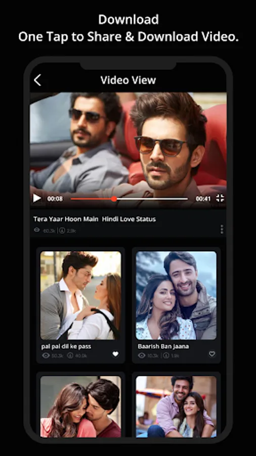 Love Video Status has a large collection of best Love Video Songs Status to share your WhatsApp story status. Set your WhatsApp status according to your mood. Romantic Video Status app provide all type of video status easily share & download on social media. Love Status App is the best way to cover the full status screen with beautiful videos, we have a good collection for you here that you can download and share on your social media status/story.