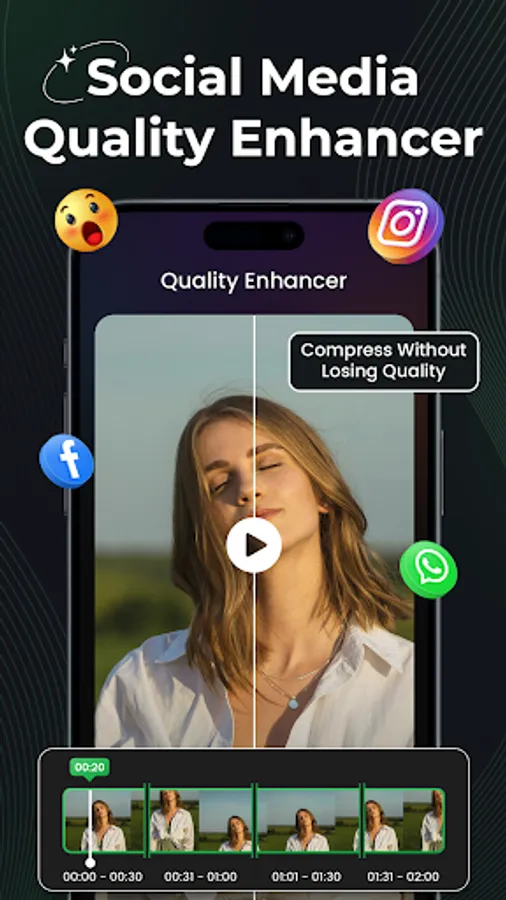 Auto-enhance and split videos for WhatsApp Status (30s), Instagram Stories (60s), Reels (90s), and Facebook β powered by AI compression without losing quality.