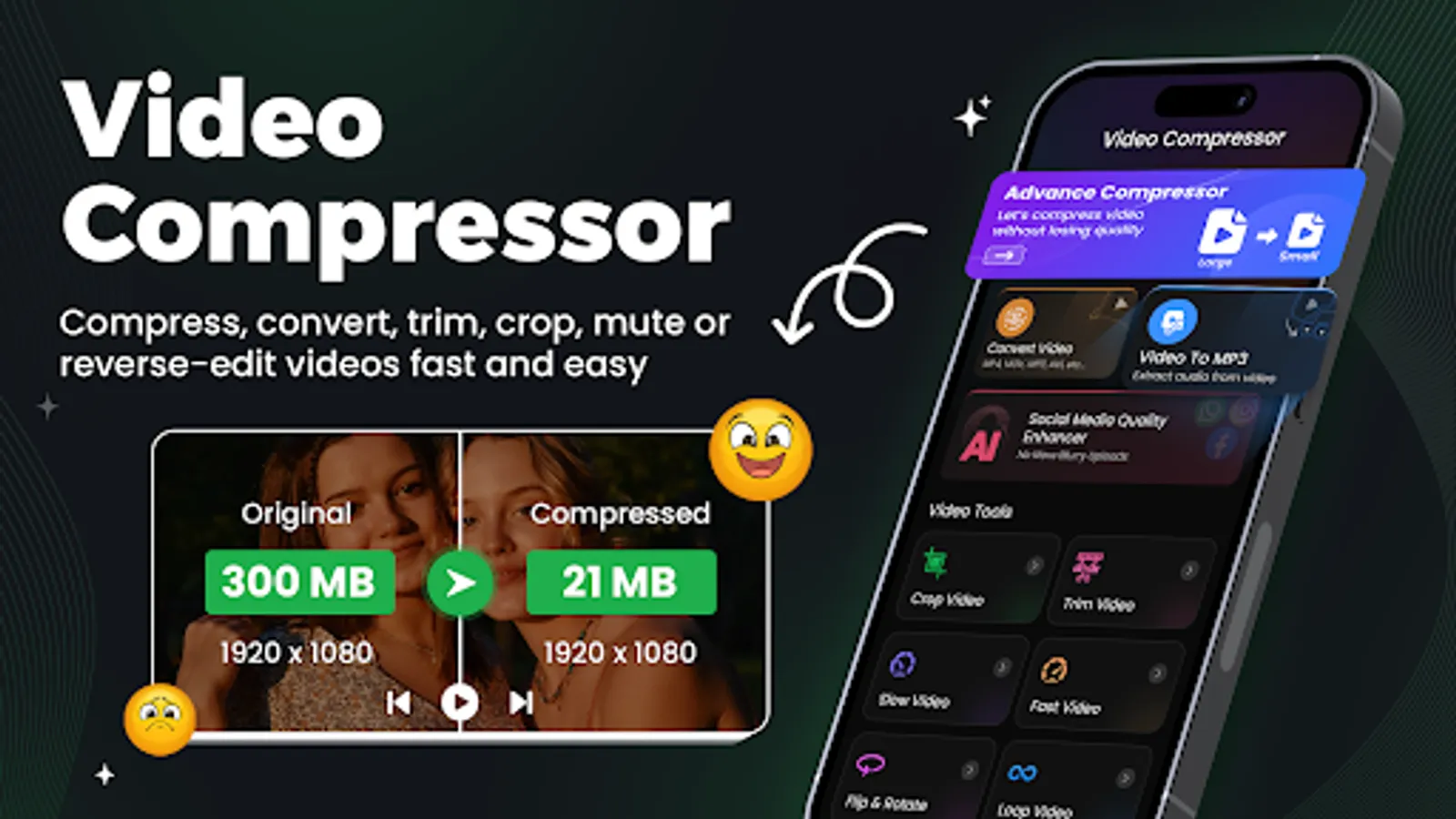 Looking for an all-in-one video compressor and video converter for your videos? Whether you're shrinking file size for WhatsApp, converting MP4 to MP3, or trimming clips for social media β this app delivers speed, quality, and simplicity.