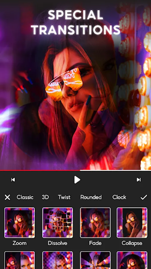 The video maker supports a variety of transition effects between rich images, including 2D, 3D, and many other interesting themed effects.
