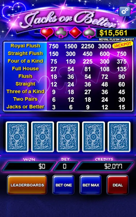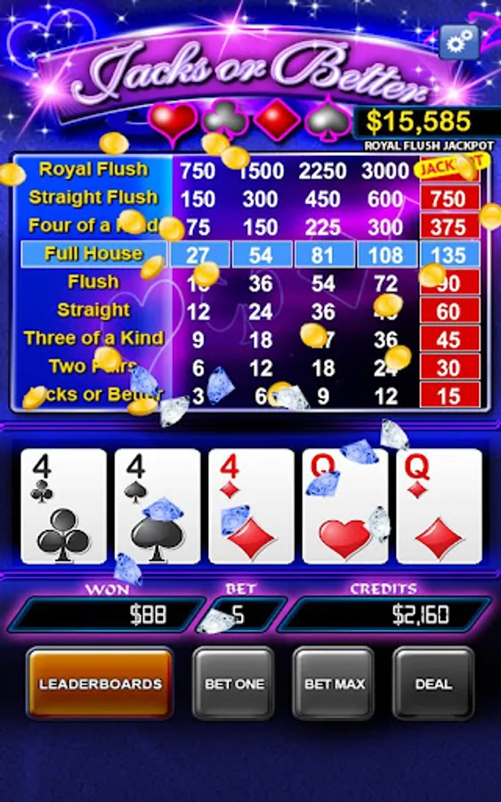 Video Poker - Jacks or Better slot machine brings the excitement or Las Vegas style video poker in the palm of your hand. With stunning graphics and world wide leaderboards this is a game you can play for hours! Install today and see for yourself.