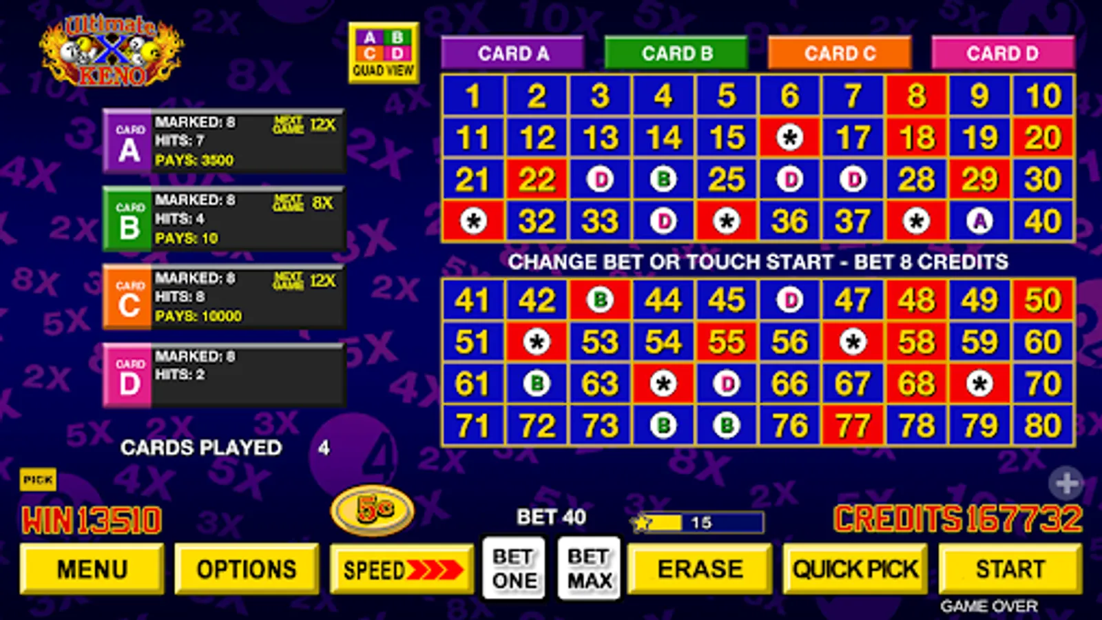 Ultimate X Keno takes Four Card Keno and combines the thrills of the Ultimate X multiplier action to create the most excitement ever experienced in a keno game.