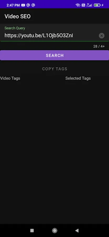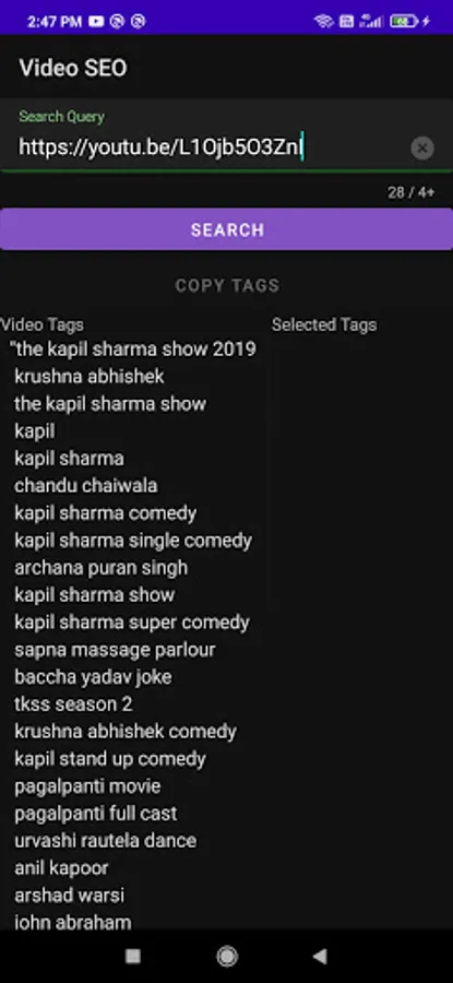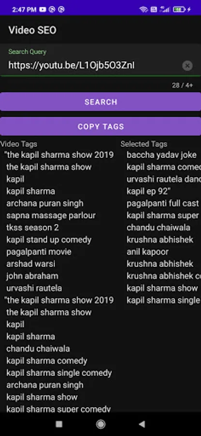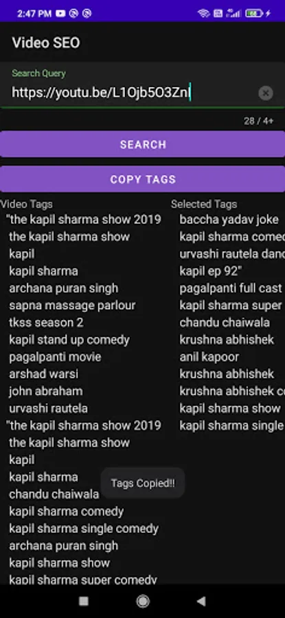 Due to high speed internet and improved camera phone, everybody is shooting videos and uploading on the internet. They need relevant tags for their videos to increase the views, likes. Video SEO app helps to get video tags from youtube video link to optimize the video to upload on the internet. it will provide keywords - tags for videos and improve SEO.