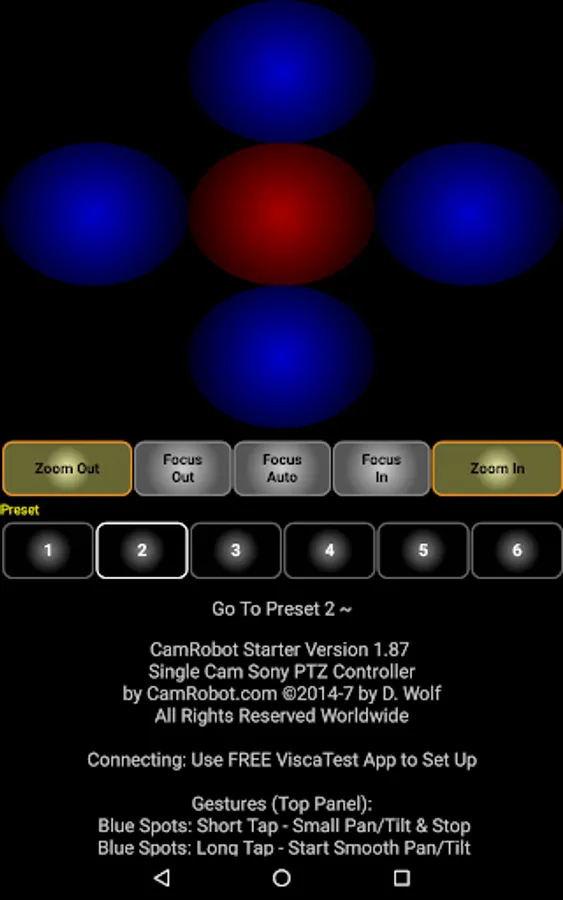 1. First use our FREE ViscaTest app to test if you can control Sony or other Visca PTZ cameras with your Android device. Try connecting and controlling a PTZ camera to your Android device with ViscaTest.