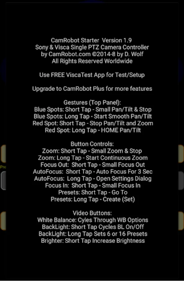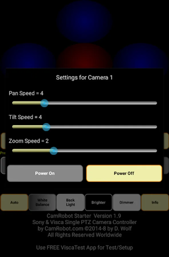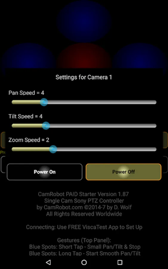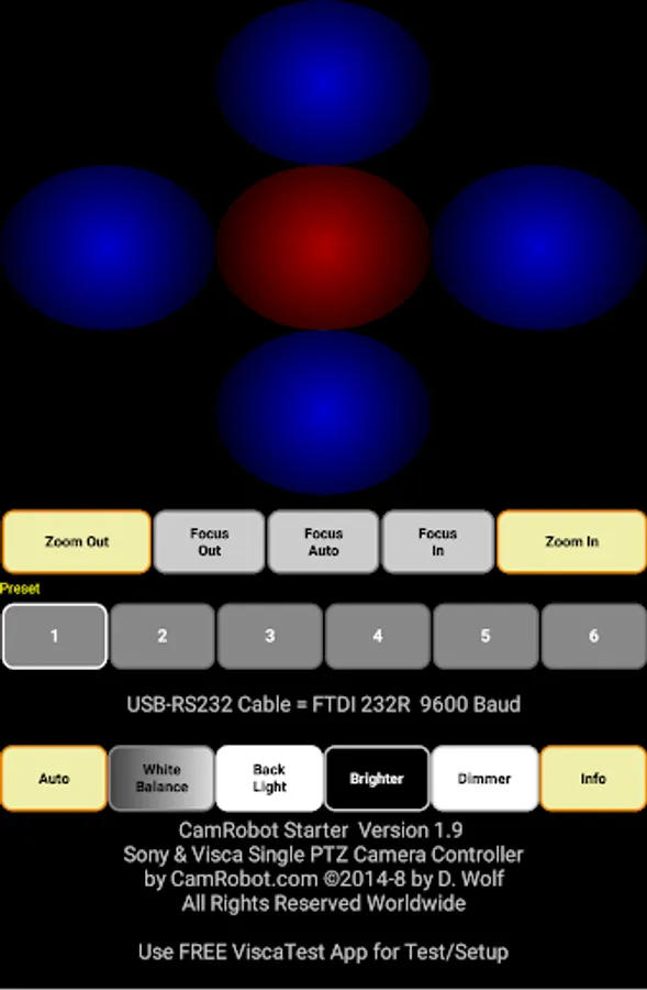 2. Then purchase this (Starter) version of CamRobot. Works with popular Sony PTZ cameras like EVI-D90, EVI-D80, EVI-D70, EVI-D30, and many other Visca PTZ cams. This app lets you pan/tilt/zoom, focus, and set backlight, white balance, and more - for one camera.