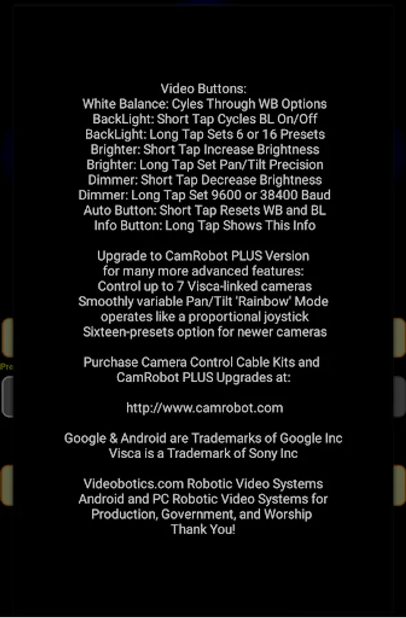 3. For more information, upgrading to CamRobot PLUS (Advanced) version (with multi-camera capabilities, smooth variable-speed pan/tilt and more), purchasing Visca cable info and kits, please visit: