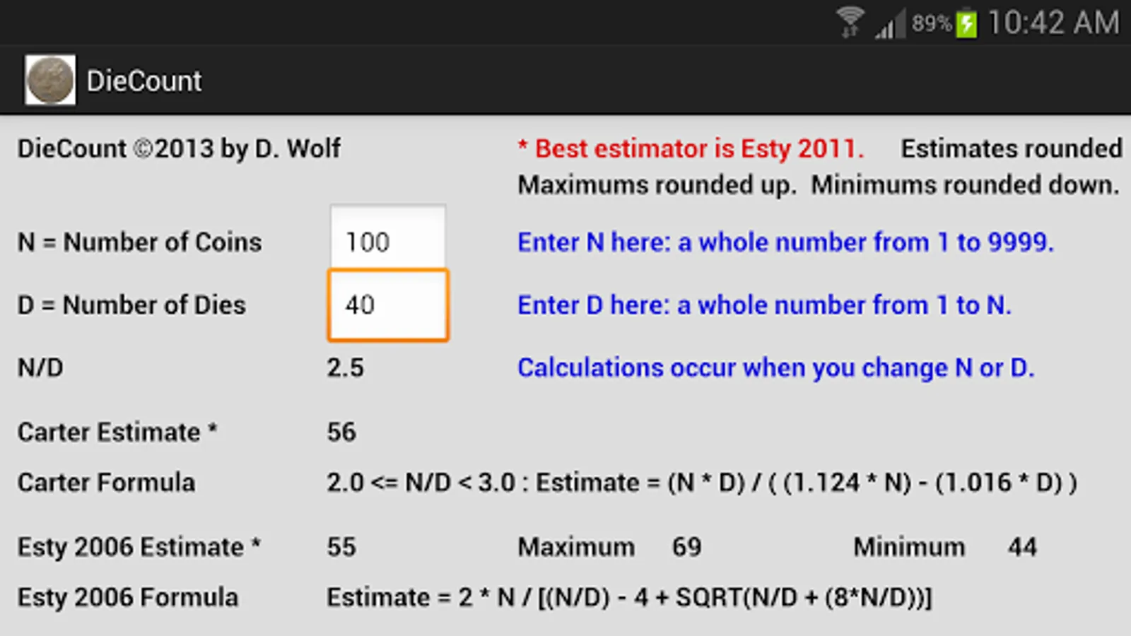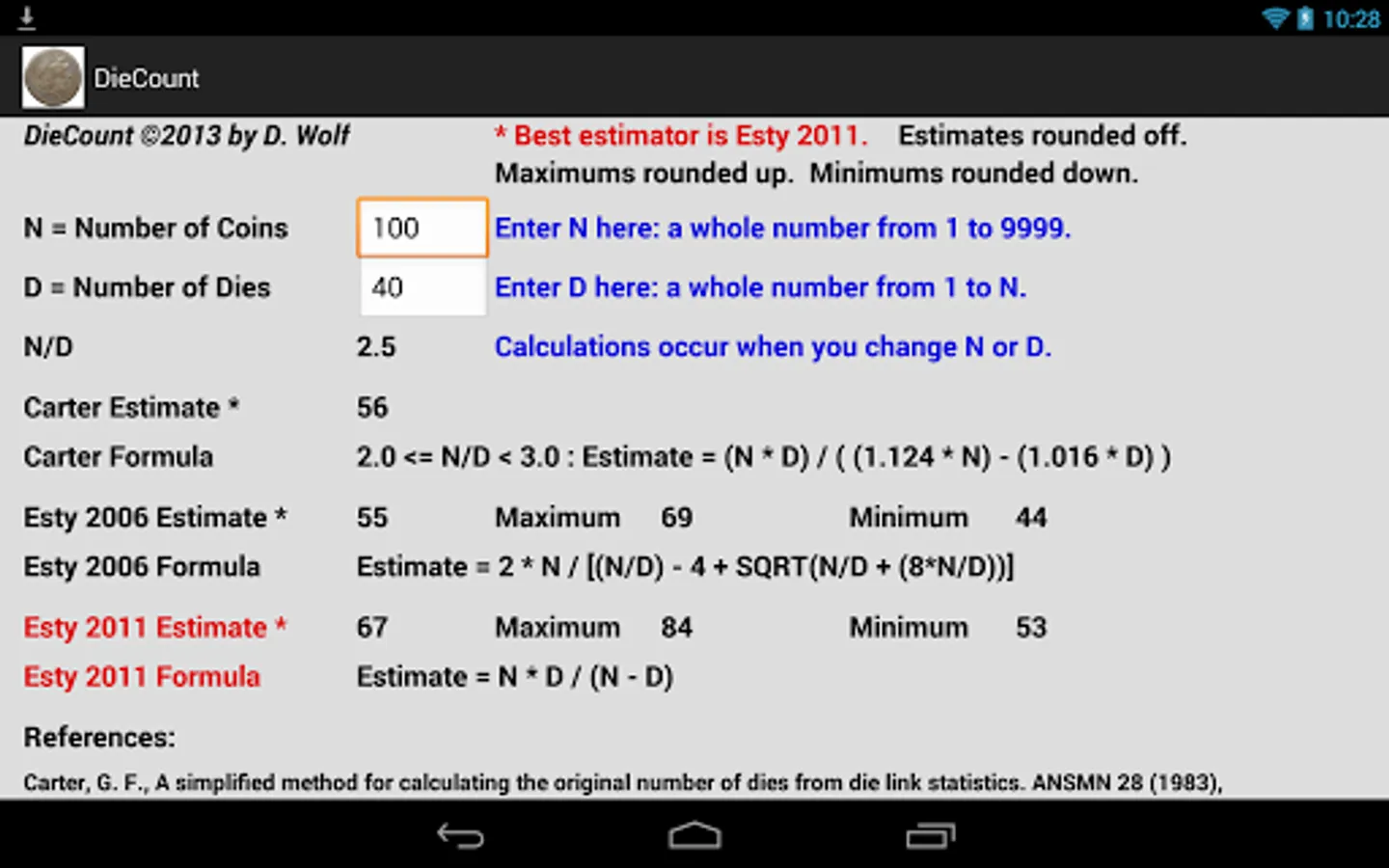 Special purpose calculator for numismatic research. Computes numbers of dies based on numerical die-match values from die studies, employing three published formulae. Automatic calculations are performed as data is entered. Assures correct calculations that are otherwise prone to human error and tedious to repeat. Now numismatic researchers can perform die study calculations using most Android phones and tablets.