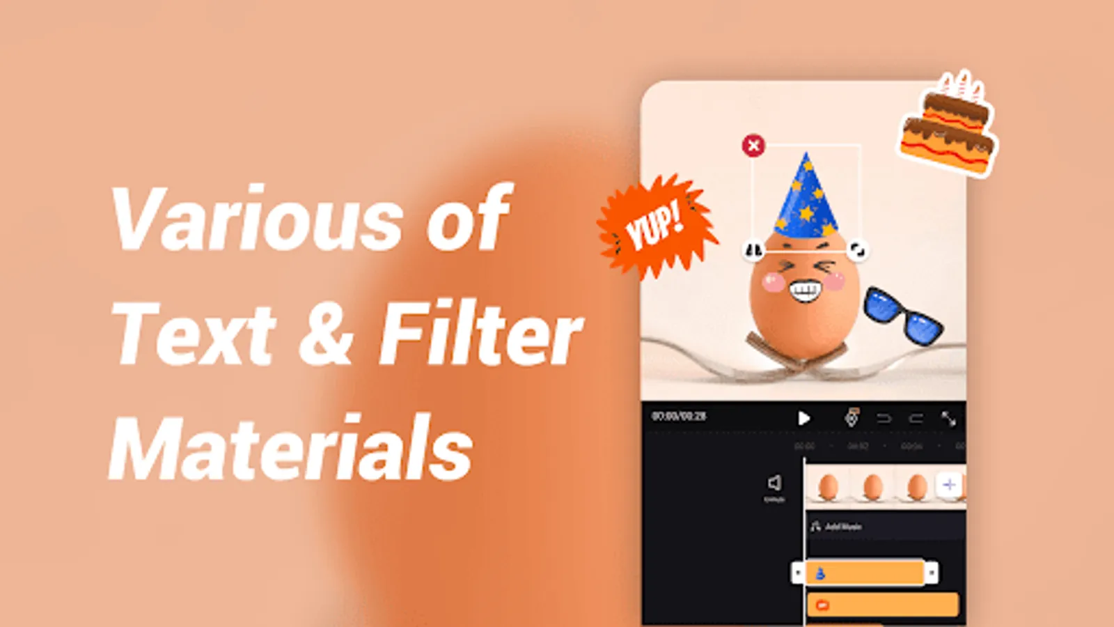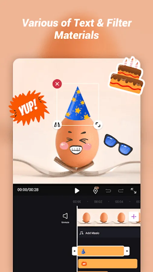 •Multiple and all kinds of stickers and text fonts are available.Add fun and cute elements to your video, such as emojis, animals, flowers, or birthdays stickers.
