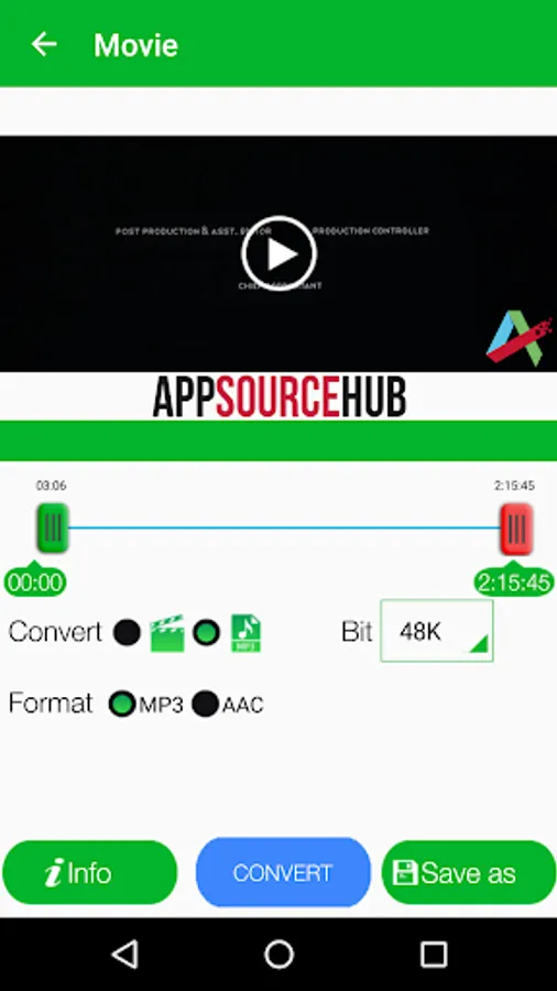 Video MP3 Converter is easy and powerful video editor app to convert, edit and trim your videos, Audios. Save in MP3 & AAC from bit rate 48kbps to 320kbps and different videos resolution from 320X180 to 1280X720