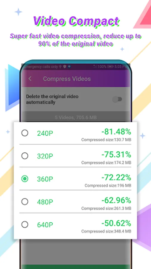 This application also supports many compression technologies of video to reduce the capacity of the video to the lowest level without reducing the quality of the video, you can compress video size from large to small and compress video without losing quality, click screen size or bitrate and many other methods. Supports video compression formats: 4K, 2K, FullHD 1080, HD 720 ... Especially this video editor and compressor application also supports compressed video storage capacity to save your time for video mp3 converter ringtone.