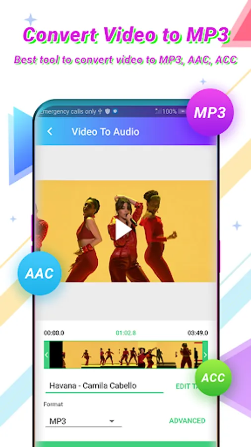 - Video to mp3 extractor with output formats: MP3, AAC, ACC