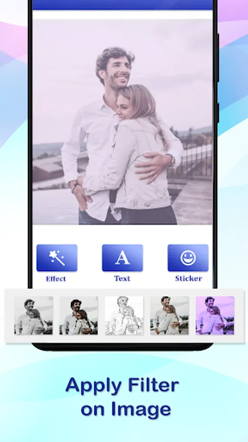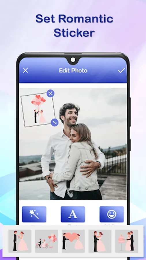 ⇢ Edit Photo with Happy Anniversary stickers, add Anniversary text or messages and by applying Effects on photo.