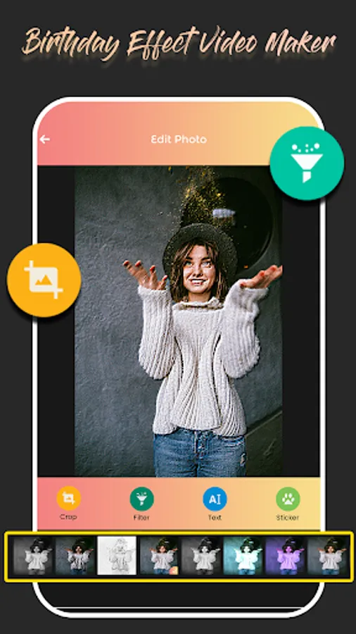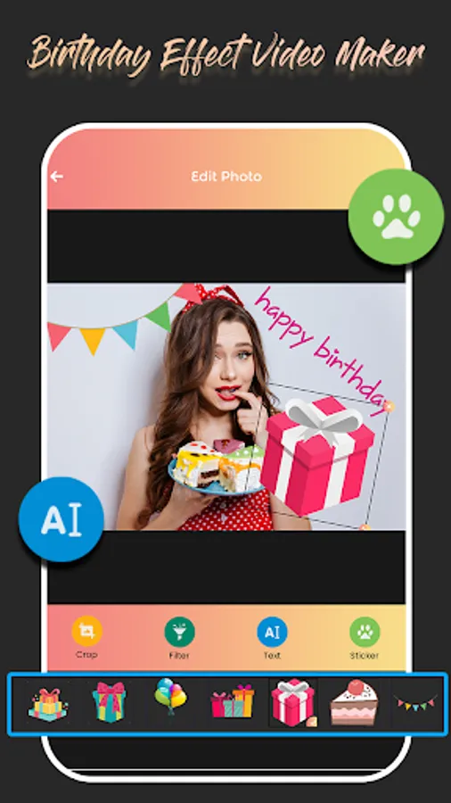 ⇢ Edit Photo with Birthday stickers, add text, Birthday Frames and by applying Effects on photo or video.