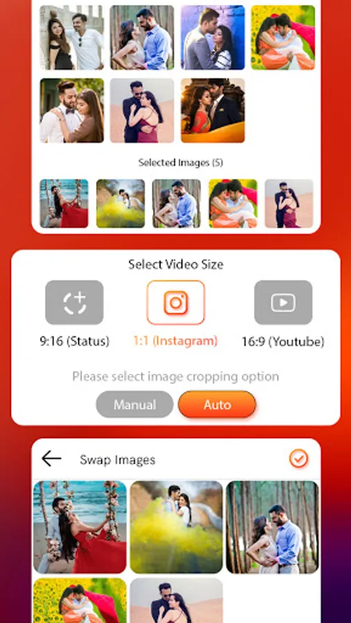 - Select Format for Whatsapp Status (9:16), Square Instagram Post (1:1) & YouTube Videos (16:9).