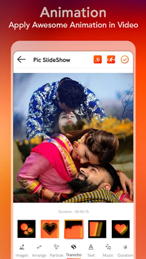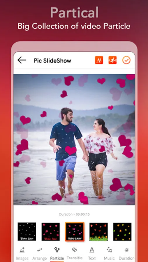 - In Edit Screen you are adding particles on videos with different style of transition.