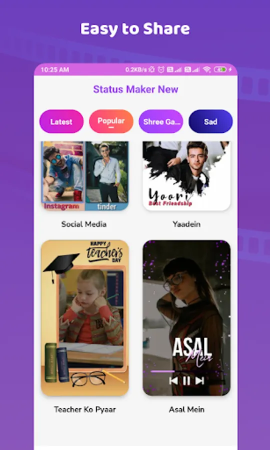 You can create Lyrical Photo Status, Birthday Video Status, Anniversary Video Status, Magical Video Status, MV Video Status and many other awesome videos.