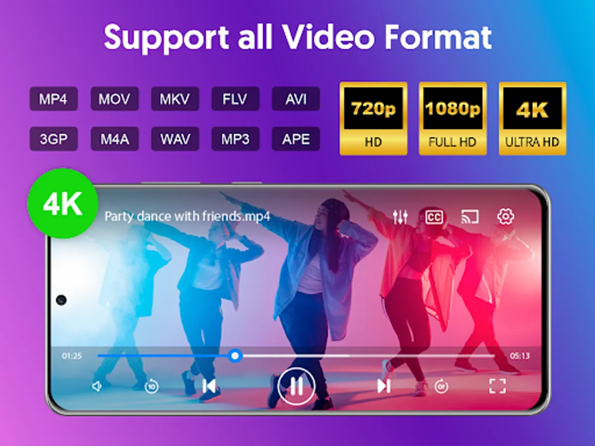 The Movie Player supports audio/video content in 3gp, Mkv player, 4k HD, 4k & Mp4 Player Formats.