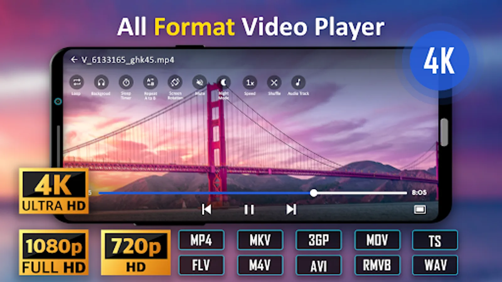 Play all format videos including MKV, MP4, M4V, AVI, MOV, 3GP, FLV, WMV, RMVB, TS, etc.