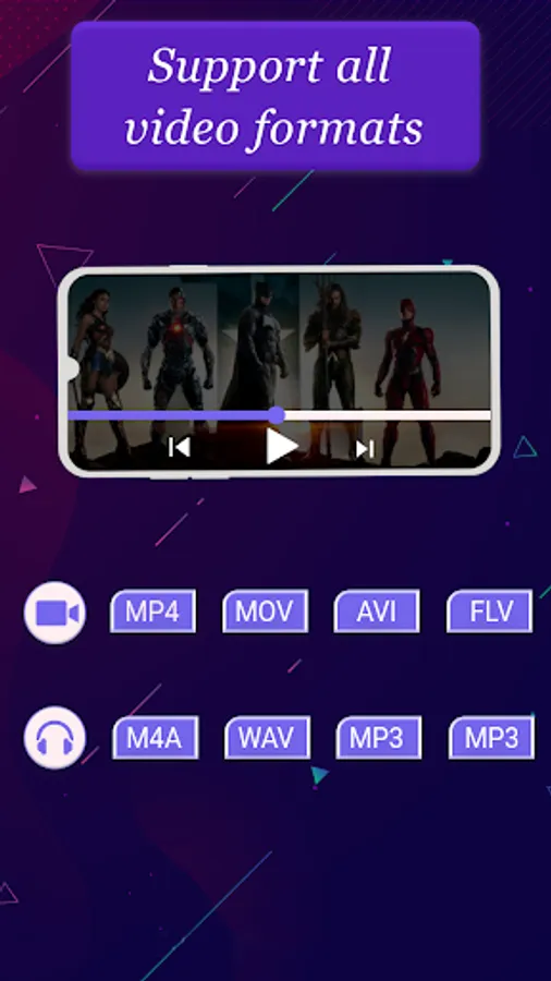 Video player supports almost all video formats including AVI, MP4, WMV, RMVB, MKV, 3GP, M4V, MOV, TS, MPG, FLV, etc., depending on your device's decoder.