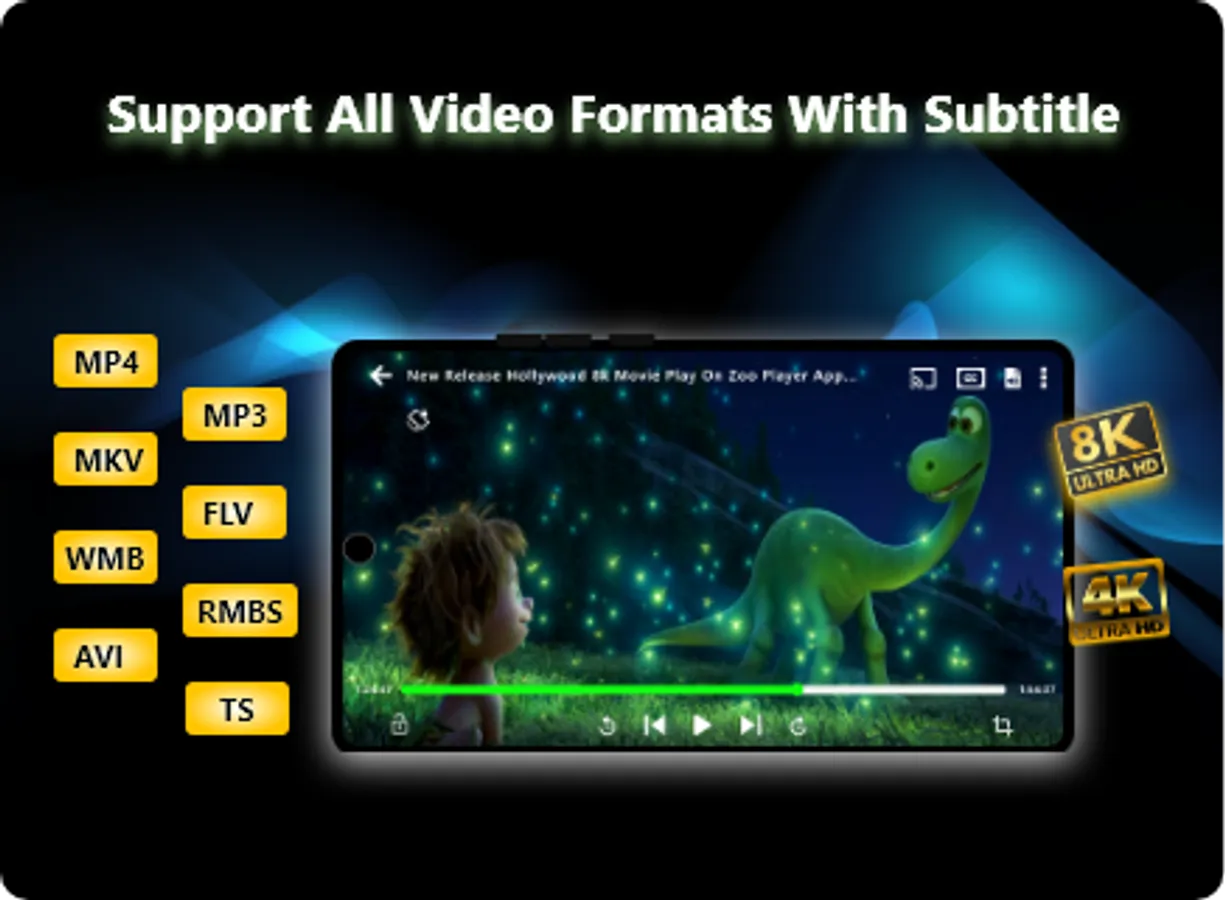 Support all media formats, including Mkv, mp4, m4v, Avi, MOV, 3gp, Flv, WMV, Rmvb, ts, and ultra HD, with 4k and 8k video resolution.