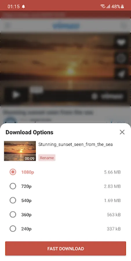It's the fastest video downloader on market. Just click on the video, choose video quality and download video. The video will download automatic on background process. After video download, you can watch it, on your device or in our app. And then you can share it with your friends via other social media apps.