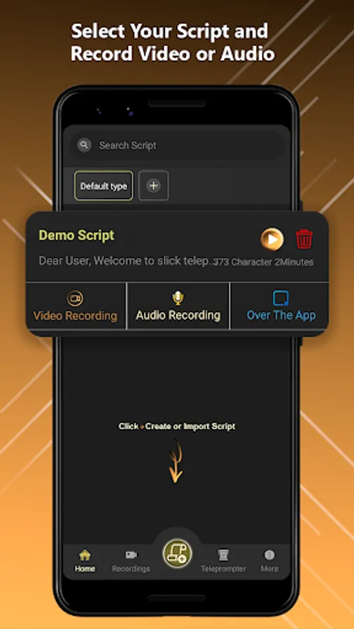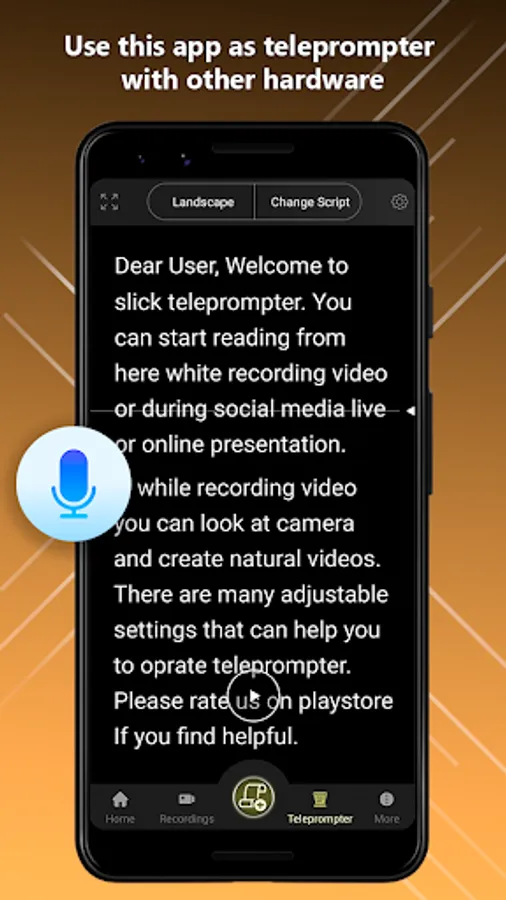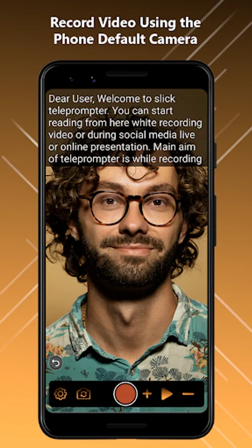 You read your script with a smart prompter and record a video clip from the front/back-facing camera at the same time. Change text scrolling speed Simply press record and read the script as it scrolls down the screen. As the script scrolls next to the camera lens, so you look like you're talking to your audience when you are actually reading!