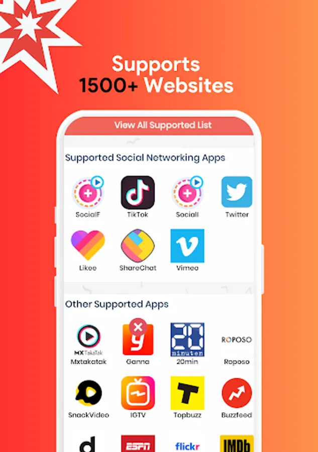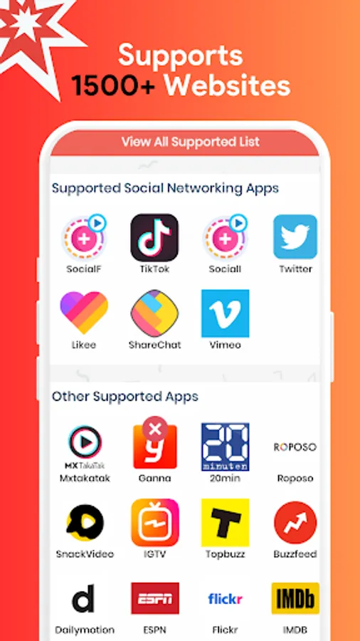 Multi-Platform Support: Download videos from 1500+ popular platforms, including Facebook, TikTok, Twitter, WhatsApp Status, Roposo, ShareChat, Snack Video, DailyMotion, and more. Video Downloader 2023 works seamlessly across multiple websites.