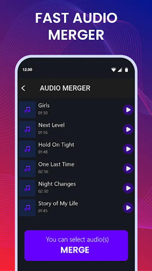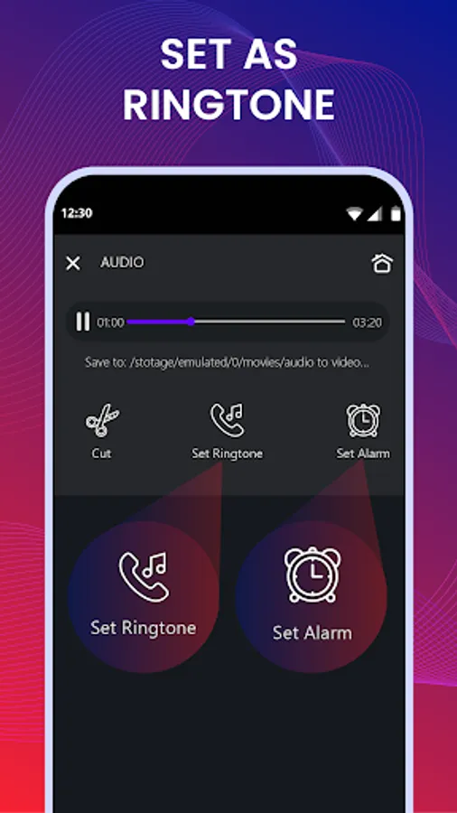 Choose your favorite audios and merge all of them to the best music. Share it with friends or set it as a ringtone, alarm.