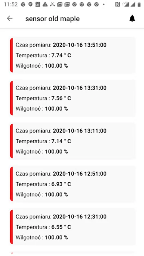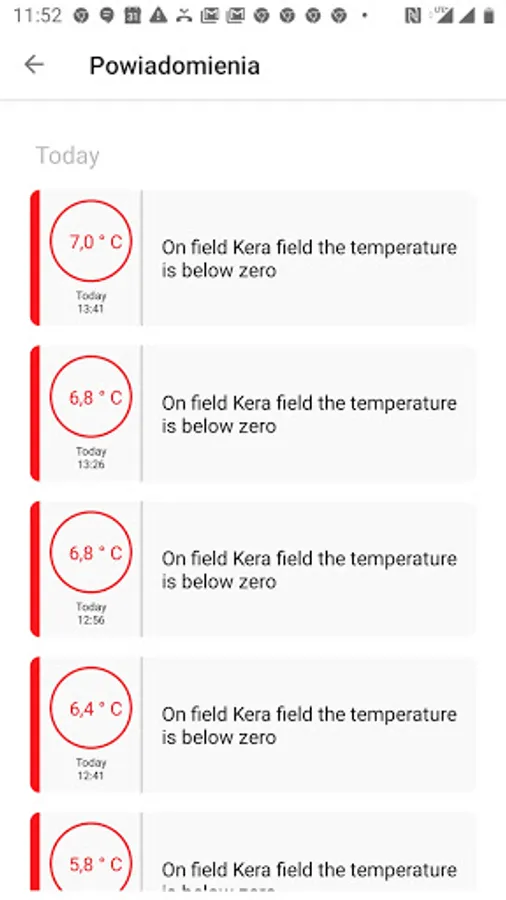 When you click on the bell at the top right of the screen you can view the last notifications. A red label appears on the bell when there are new notifications. You also get notifications on your notification centre. When the temperature drops below a threshold you get an orange message and if it drops even lower you get a red notification.