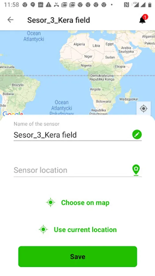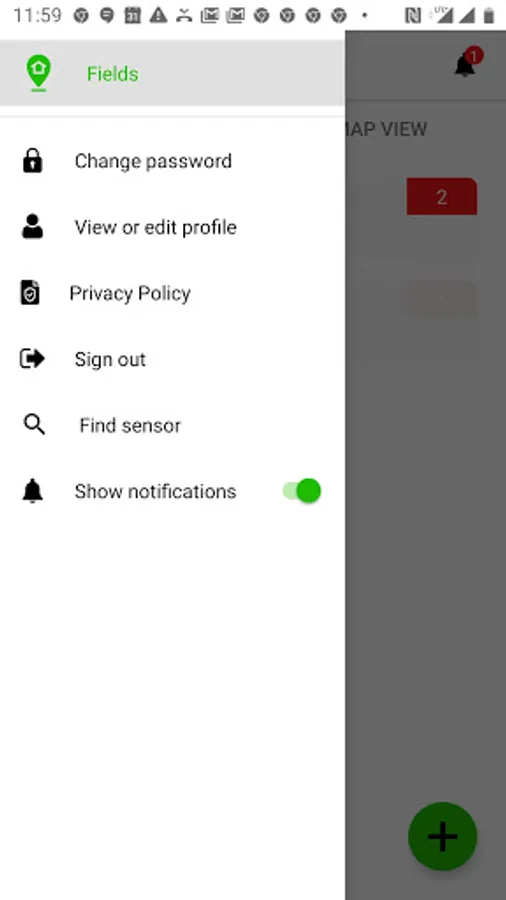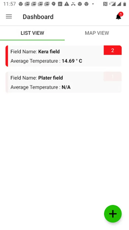 This feature is for adding or removing a new field, naming it and placing it on the map using the current location or chosen location. "Map view": this is a map view of all the fields where you can tap on each field to view the current temperature. "List view": this is a list of the fields and their average temperatures. You can click on a field and navigate to sensors.