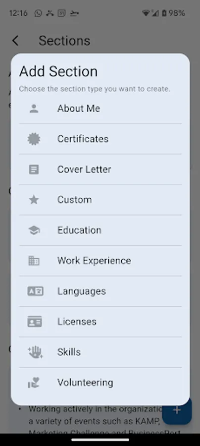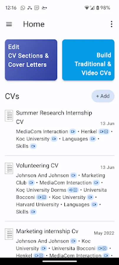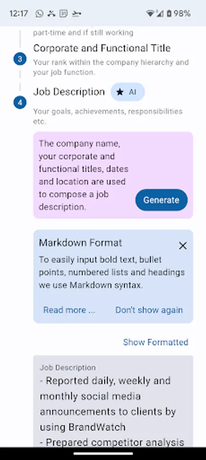 You can store multiple versions of your CV for different roles where you can emphasize your qualities and achievements specific to that role. With the help of Generative AI you can create flowing and impactful text describing your education or work activity.