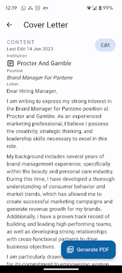 Each position is different. It's only fitting to have a custom cover letter for each position. With the help of Generative AI we can achieve this with a few clicks. You ultimately have the final control where you can edit any generated content.