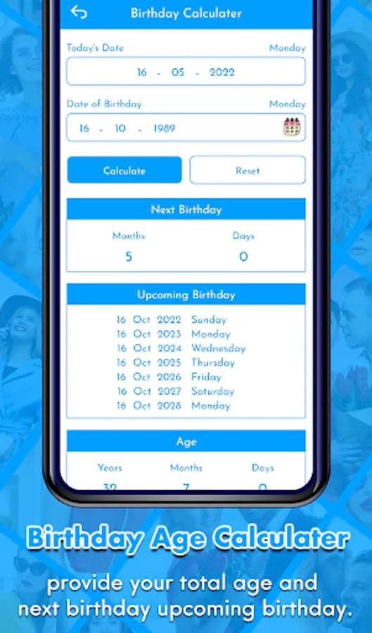 Birthday Age Calculator provide a simple user interface easy to use. just pick your birth day provide your total age and next birthday upcoming birthday.