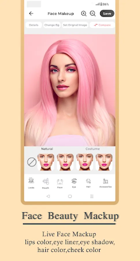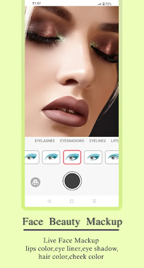 Choose from multiple shades of eye lens. Change how your eyes look in the photo. Apply new eyelashes and eyebrows from a wide range of Eye Lashes and Eyebrows. Make eyes wider and brighter.