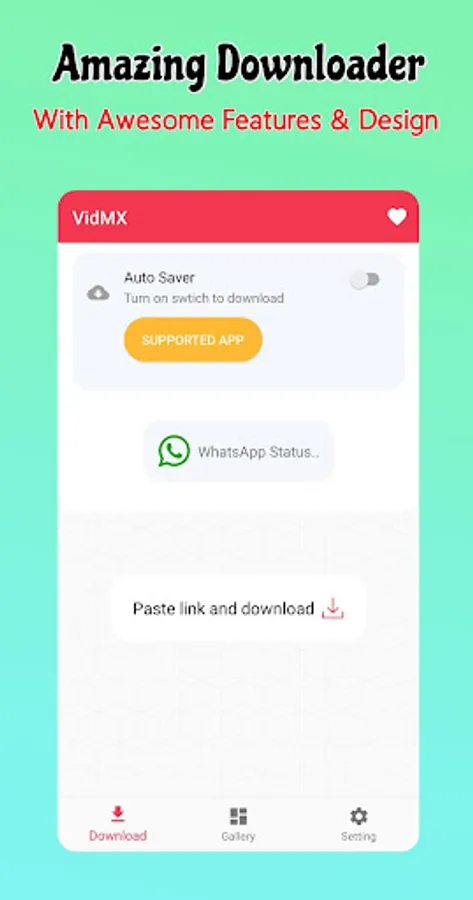 On Home Screen Of Vidmx App You will See Auto Saver Button. Just Enable it and Go To Any Video platfrom then copy Any Video Link. Boom! You Will See Video Downloading is Started Automatically. It's Also Support Image Download.