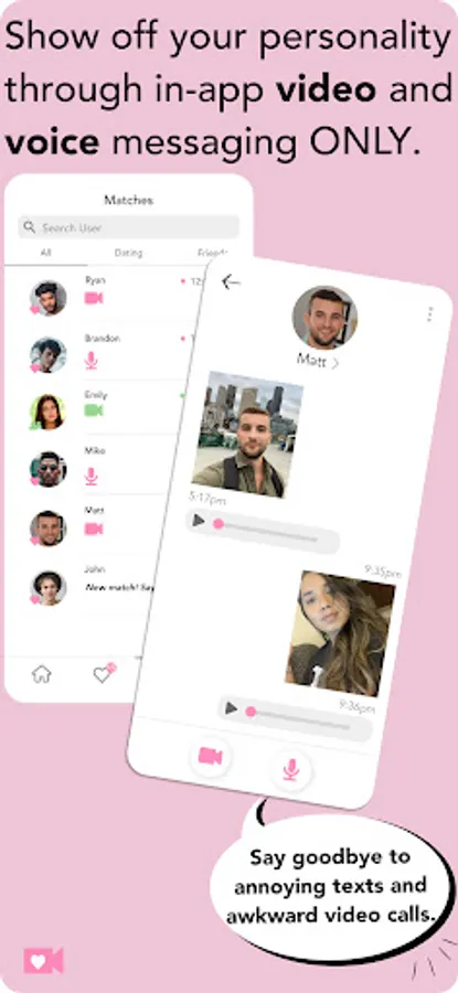 60% of women have been catfished or are worried about being catfished on dating apps. Vidn eliminates texting and the ability to upload pre-recorded videos from your camera roll. It’s all video and voice messaging here! Rest assured that you’ll know exactly who you’re talking to at all times.