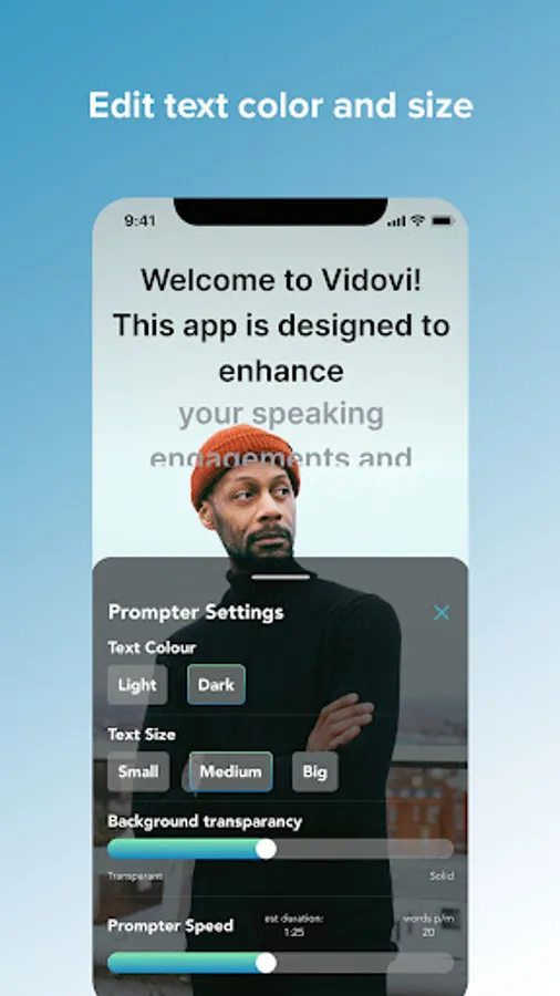 - Tailor the teleprompter to suit your unique needs. Adjust the scrolling speed, font size, to ensure optimal readability and comfort during recording.