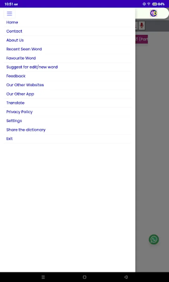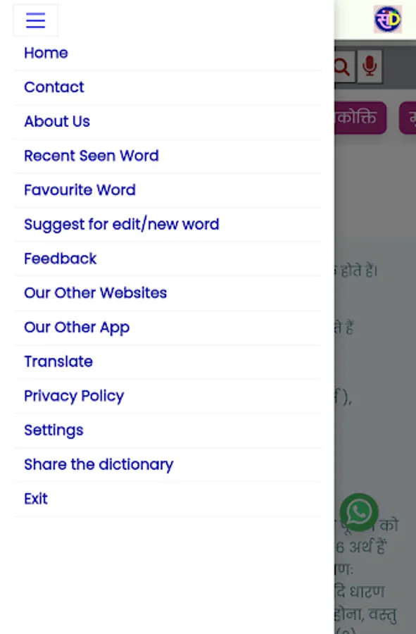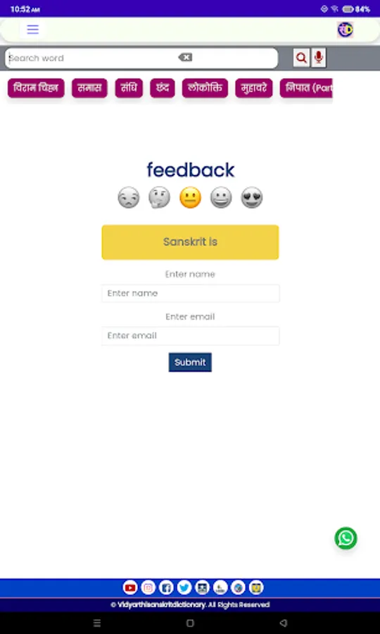 In this 'Vidyarthi Sanskrit Dictionary' app, the user has been provided with various facilities like social media share, feedback, recent seen words, favorite words, educational website visit etc.
